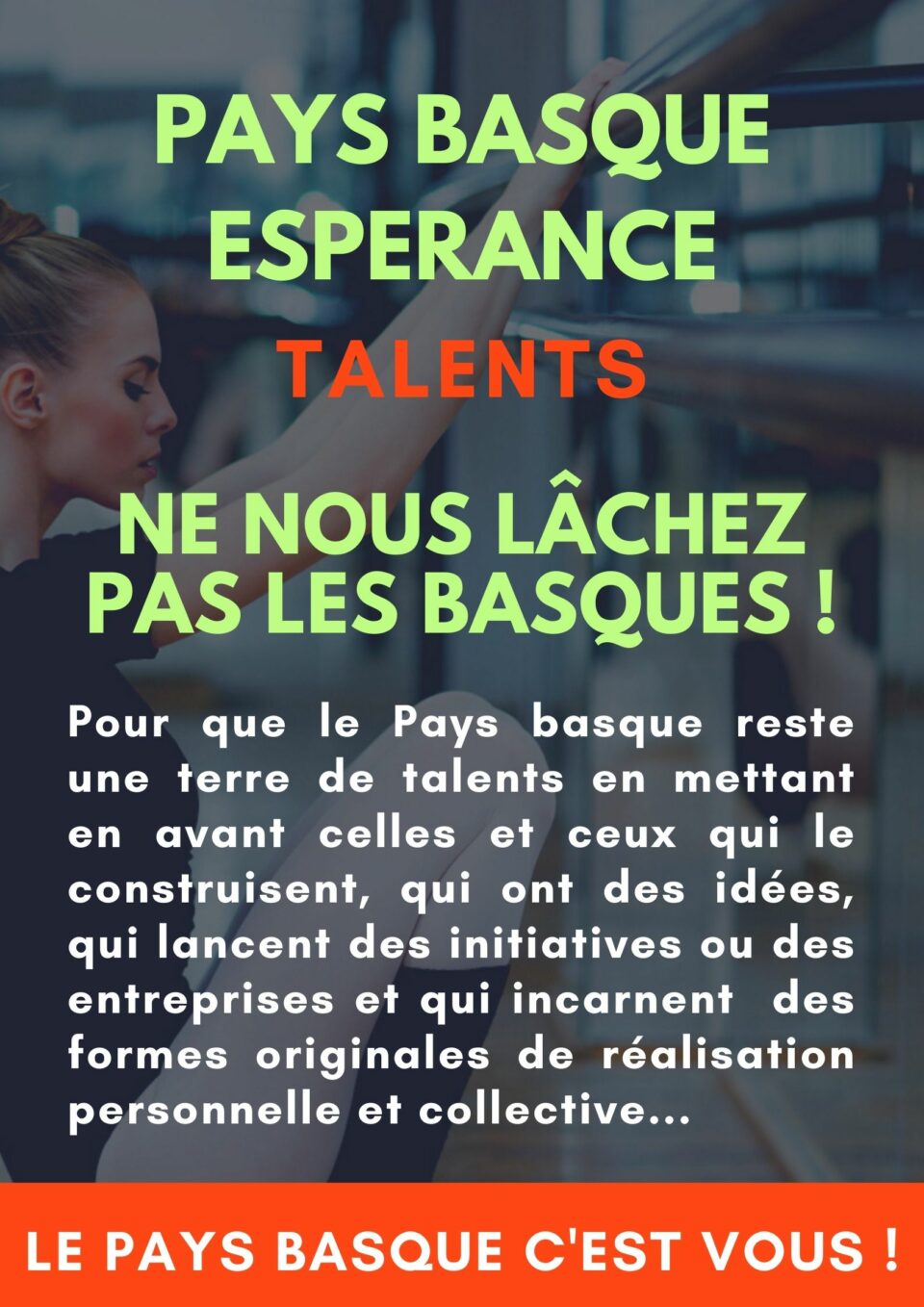 DétailsPour que le Pays Basque reste un terre de talent en créant un émulation positive, en mettant en valeur ceux qui ont des idées et des initiatives pour notre pays ou qui incarnent une forme d’accomplissement personnel qui peut servir d’exemple à tous les autres et aux jeunes générations.